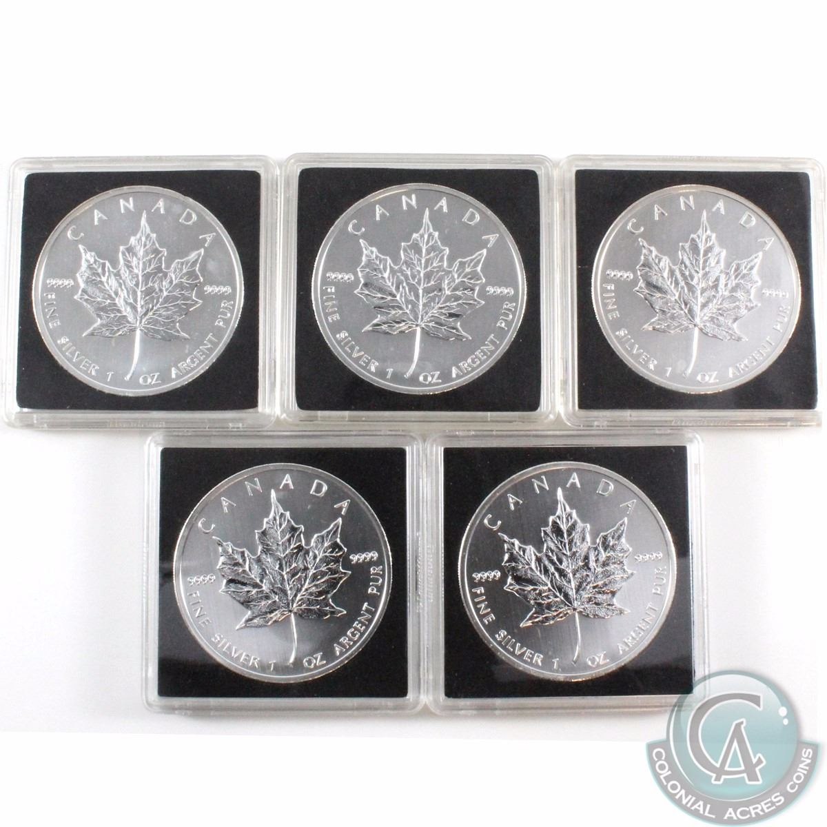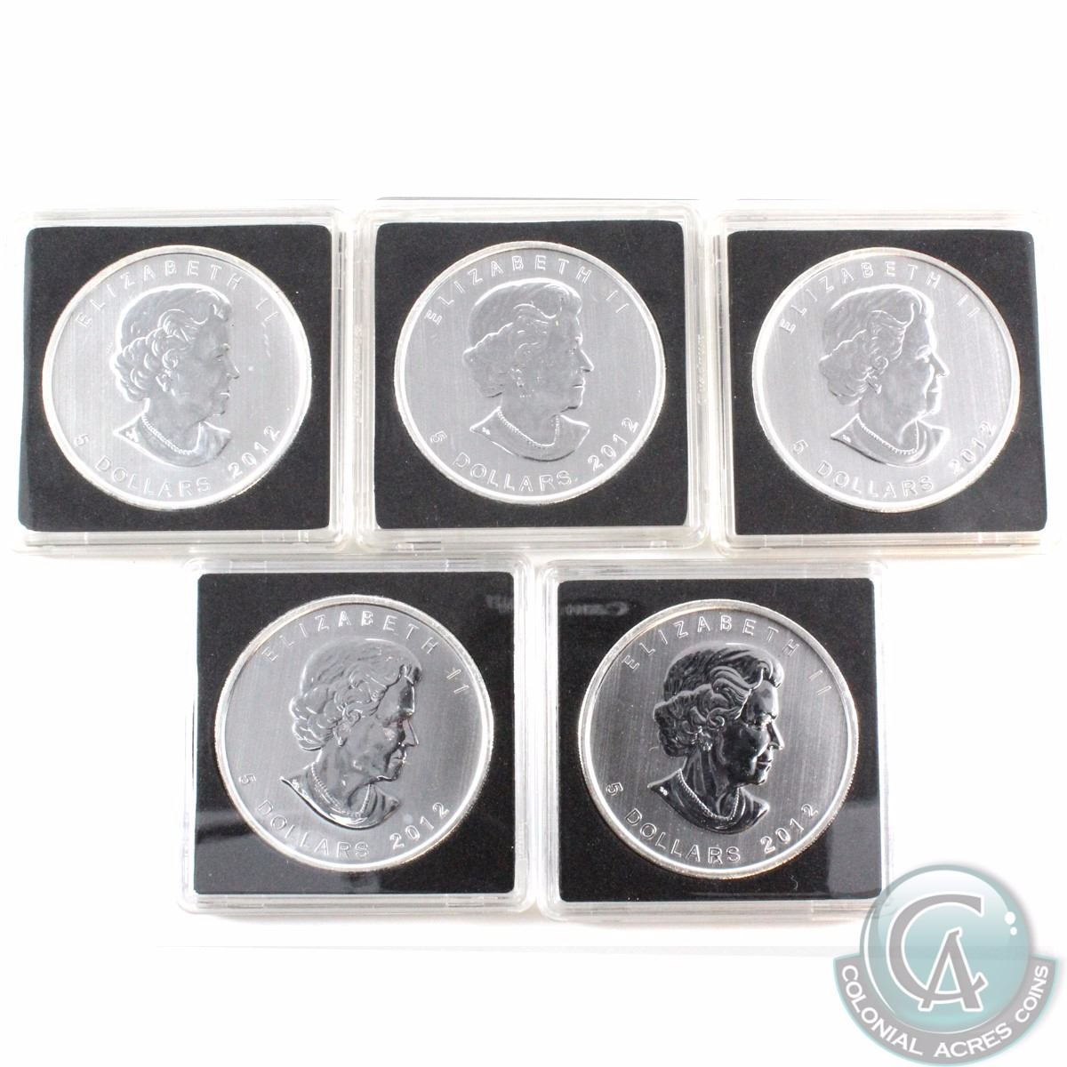 5 x 2012 Canada $5 Silver Maple Leafs in square deluxe capsules. 5pcs. (no tax)