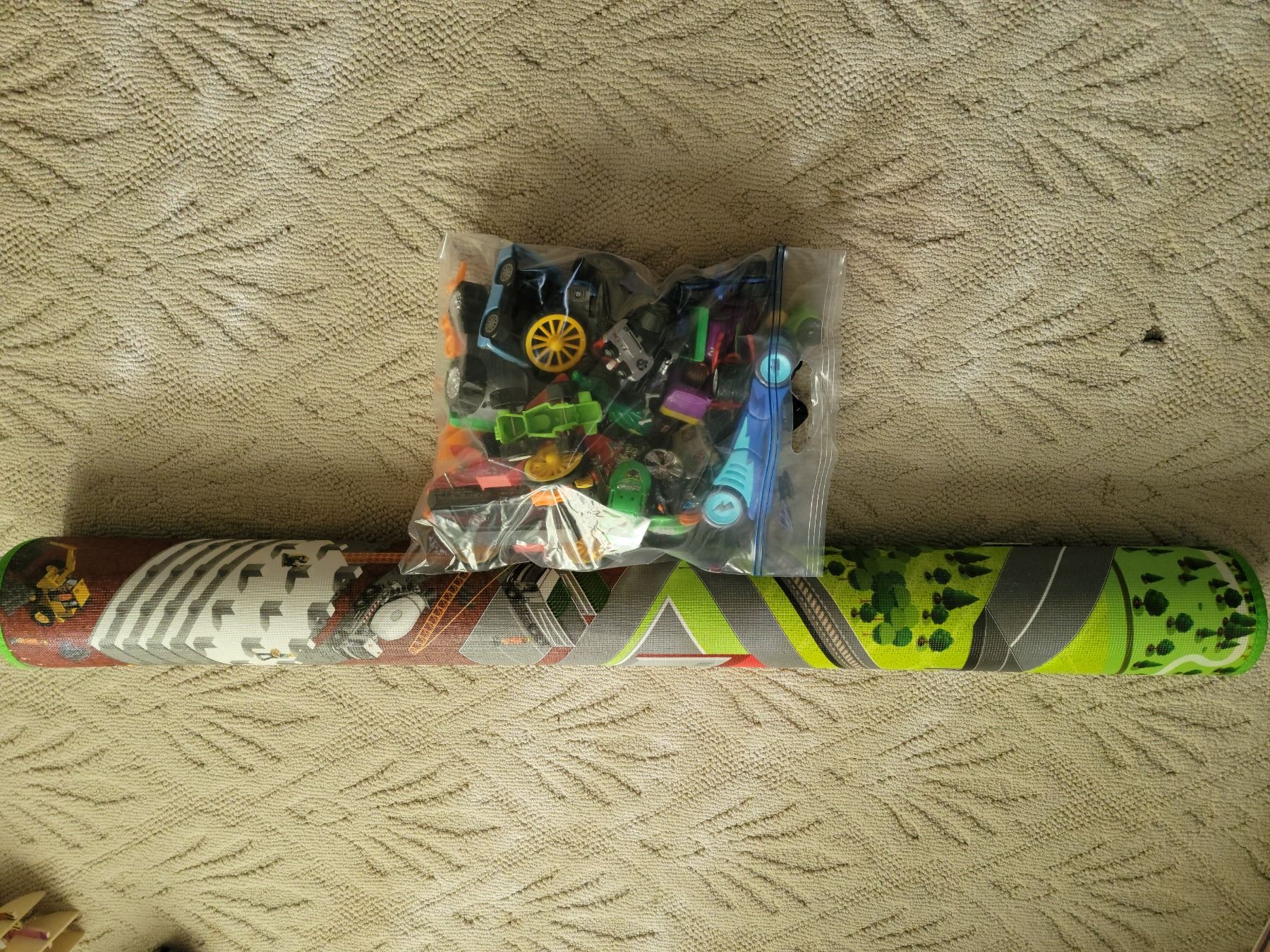 5"x 4" car play mat and bag of random toy vehicles