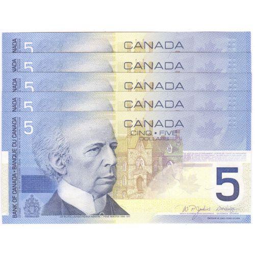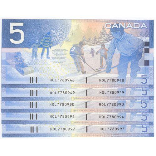 Bank of Canada, 5 x $5.00 Insert notes 2005, grade Choice to Gem UNC, Charlton # BC-62bA, signature Jenkins Dodge, serial HOL7780948-49-90-94-97, insert range 7.720M - 7.800M. Problem free notes.