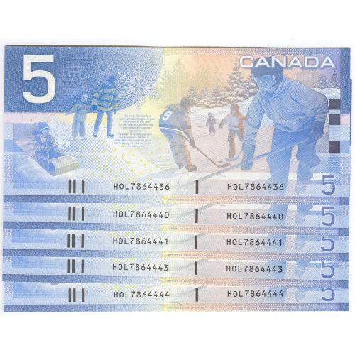 Bank of Canada, 5 x $5.00 Insert notes 2005, grade Choice to Gem UNC, Charlton # BC-62bA, signature Jenkins Dodge, serial HOL7864436-40-41-43-44, insert range 7.840M - 8.000M. Problem free notes.