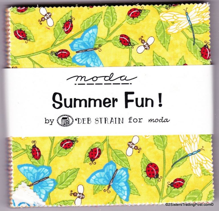 40 - 5" x 5" quilting patches 'Summer Fun!' by Deb Strain for Moda fabrics. Patches are in a variety of colors reds, blues, greens, oranges, yellows and have everything for summer fun whirly windmills, suns, butterflies, watermelons and more.
