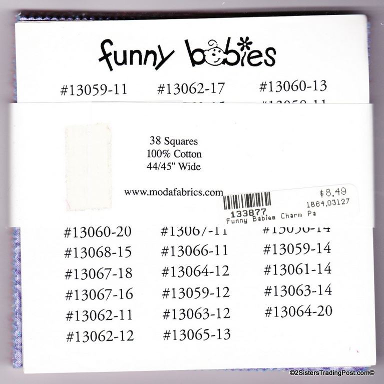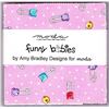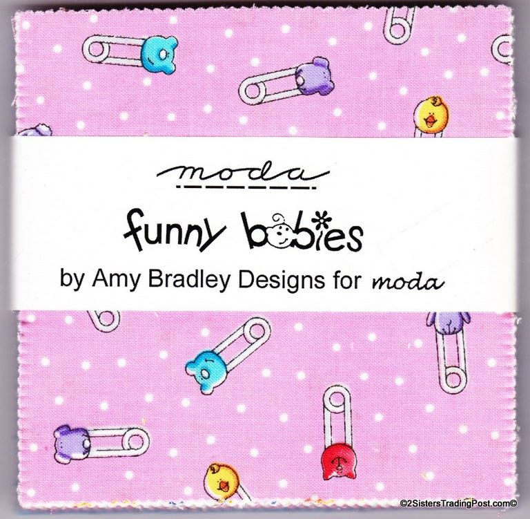 38 - 5" x 5" quilting patches 'Funny Babies' by Amy Bradley for Moda fabrics. Patches are in shades of blues, purples, pinks, yellows in a variety of children's designs.