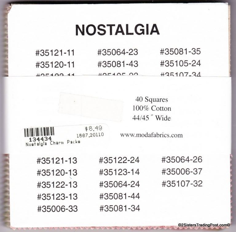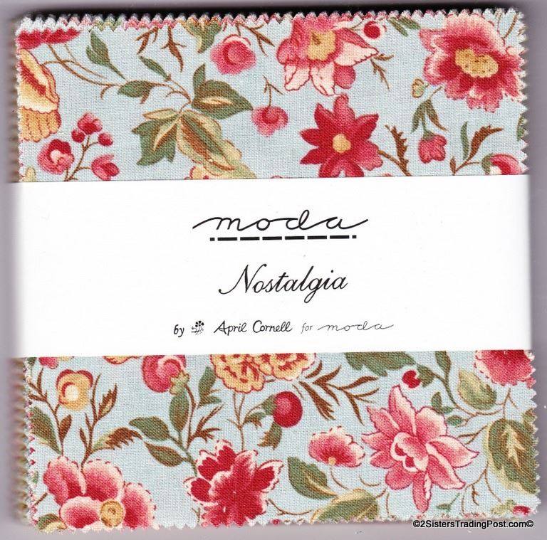 40 - 5" x 5" quilting patches 'Nostalgia' by April Corneff for Moda fabrics. Patches are in shades of blues, greens, reds and are mostly floral patterns.