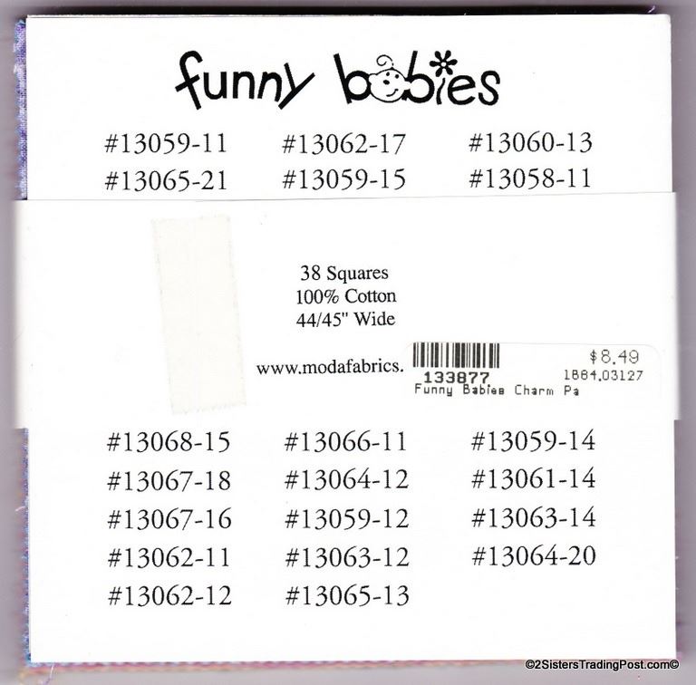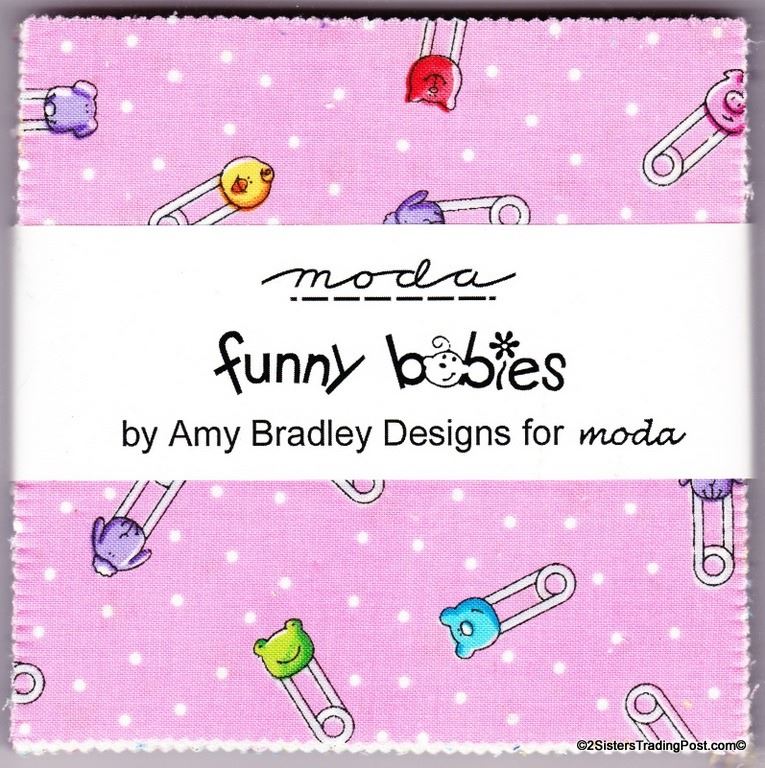 38 - 5" x 5" quilting patches 'Funny Babies' by Amy Bradley for Moda fabrics. Patches are in shades of blues, purples, pinks, yellows in a variety of children's designs.