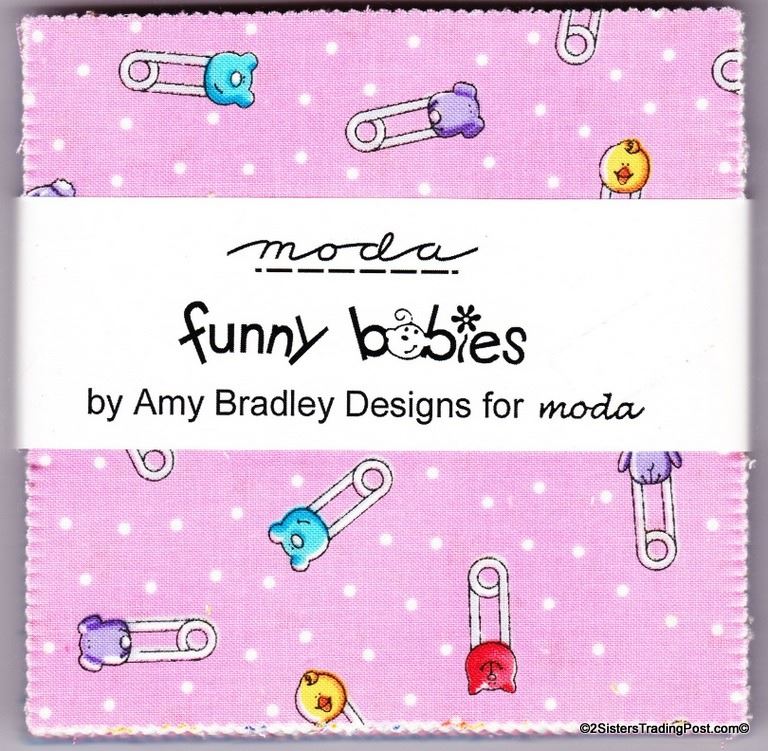 38 - 5" x 5" quilting patches 'Funny Babies' by Amy Bradley for Moda fabrics. Patches are in shades of blues, purples, pinks, yellows in a variety of children's designs.