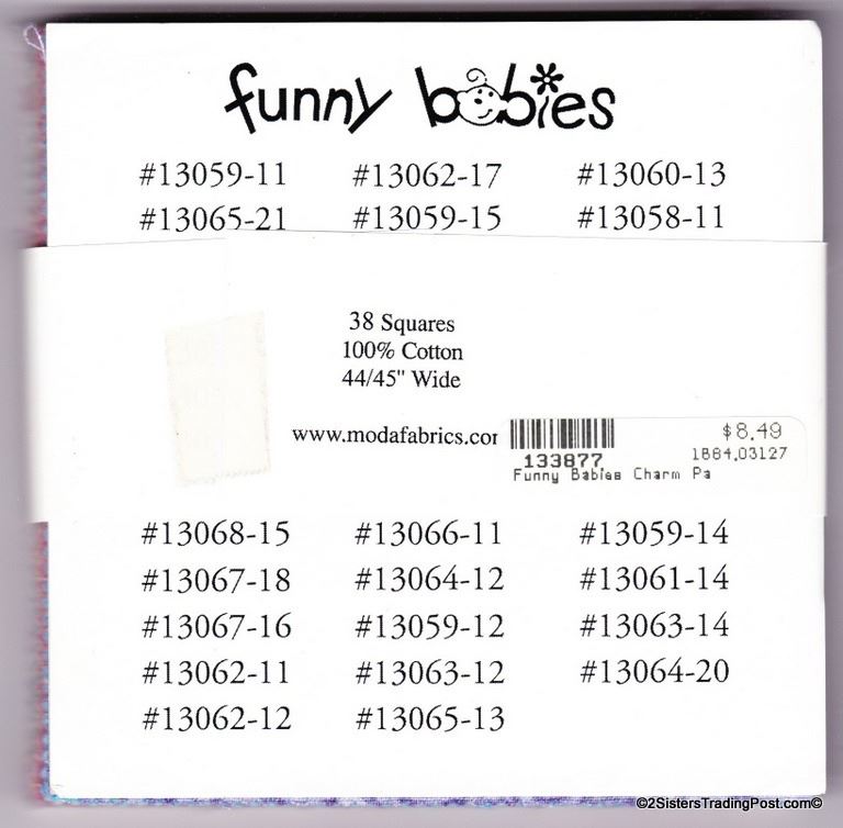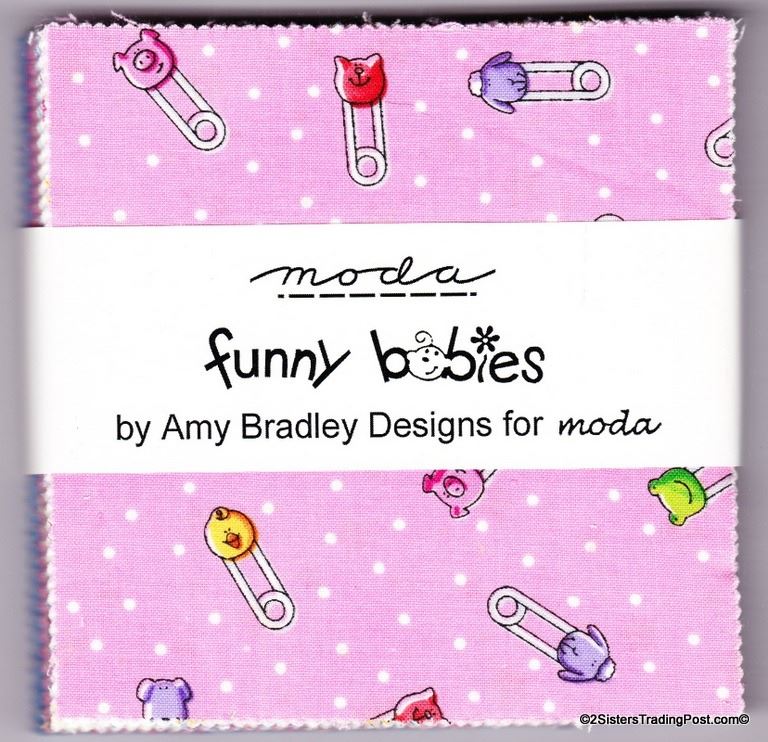 38 - 5" x 5" quilting patches 'Funny Babies' by Amy Bradley for Moda fabrics. Patches are in shades of blues, purples, pinks, yellows in a variety of children's designs.