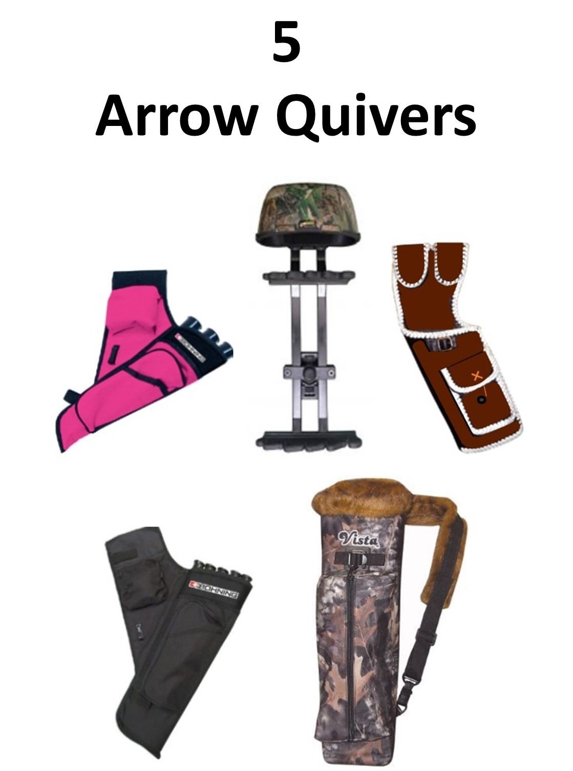 5 x Arrow Quivers, 2 x Bohning, 1-Mini Target Pink RH, 1-Black Target RH, 2 x Vista, 1-Rascal Brown RH, 1-MaverickII Back Quiver, 1 x Kwikee Kwiver HI-5 APG