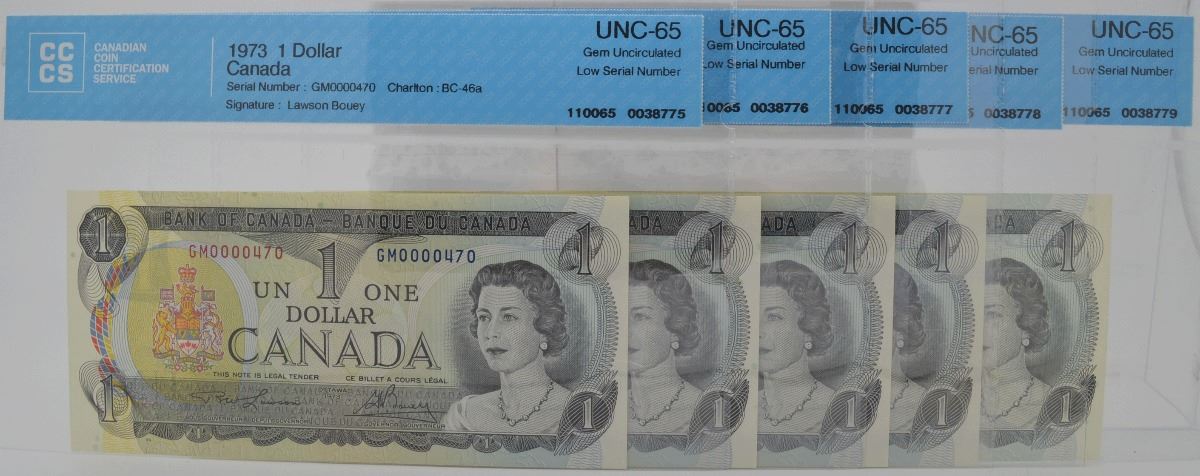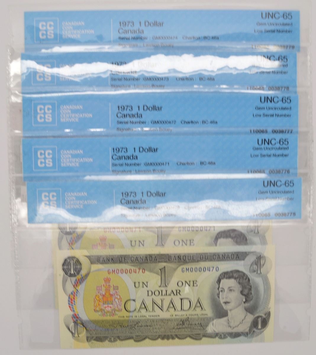 5 x Canada 1973 $1 Low Serial 0470 to 0474