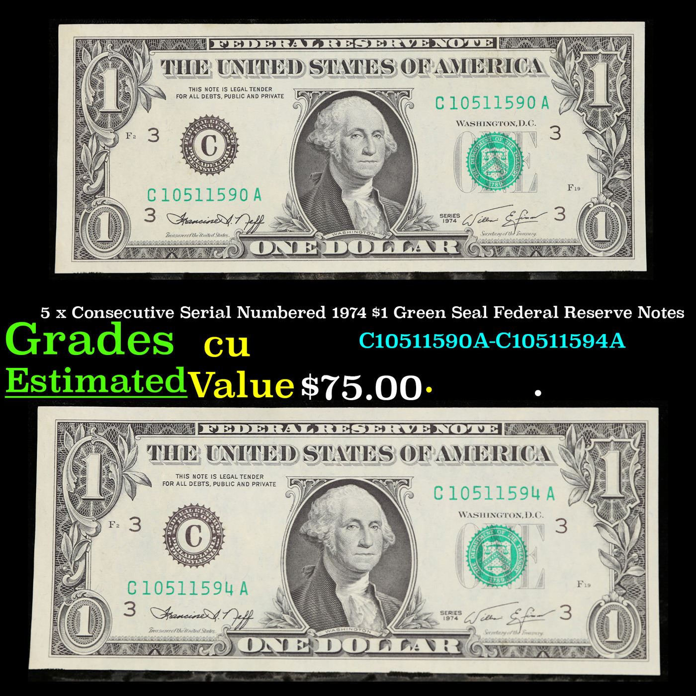 5 x Consecutive Serial Numbered 1974 $1 Green Seal Federal Reserve Notes Grades CU.