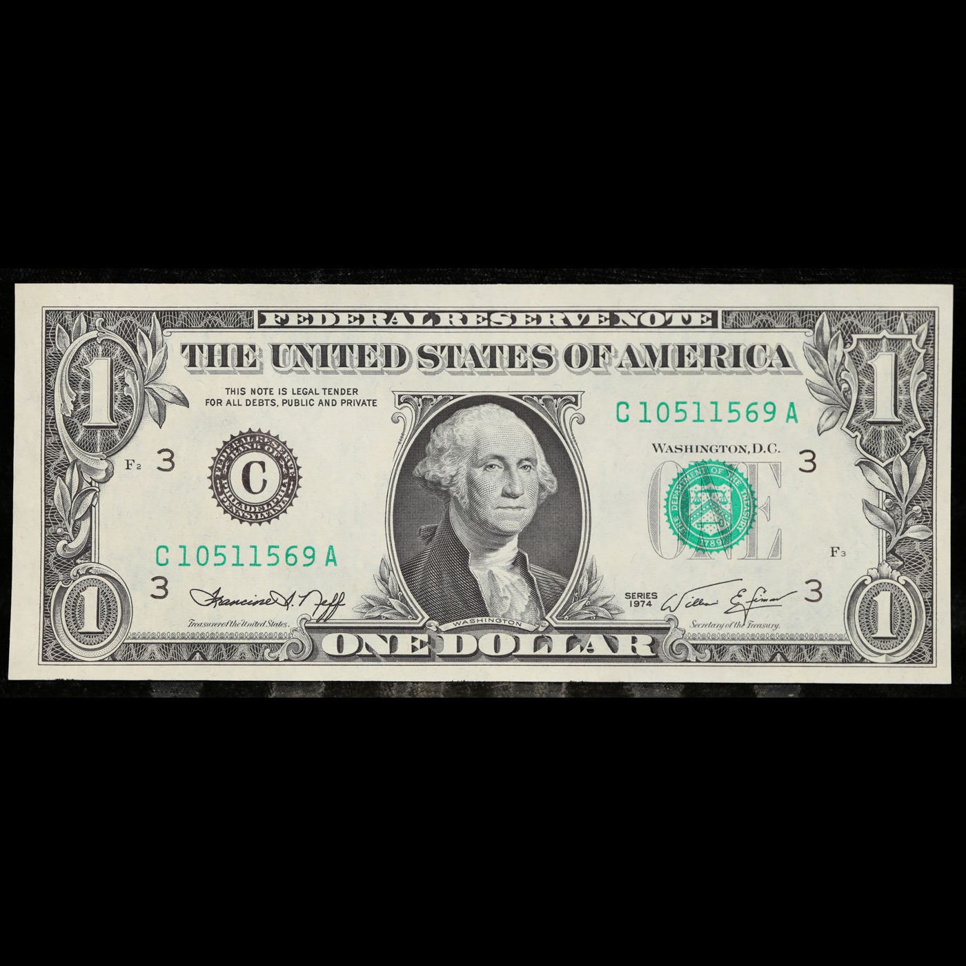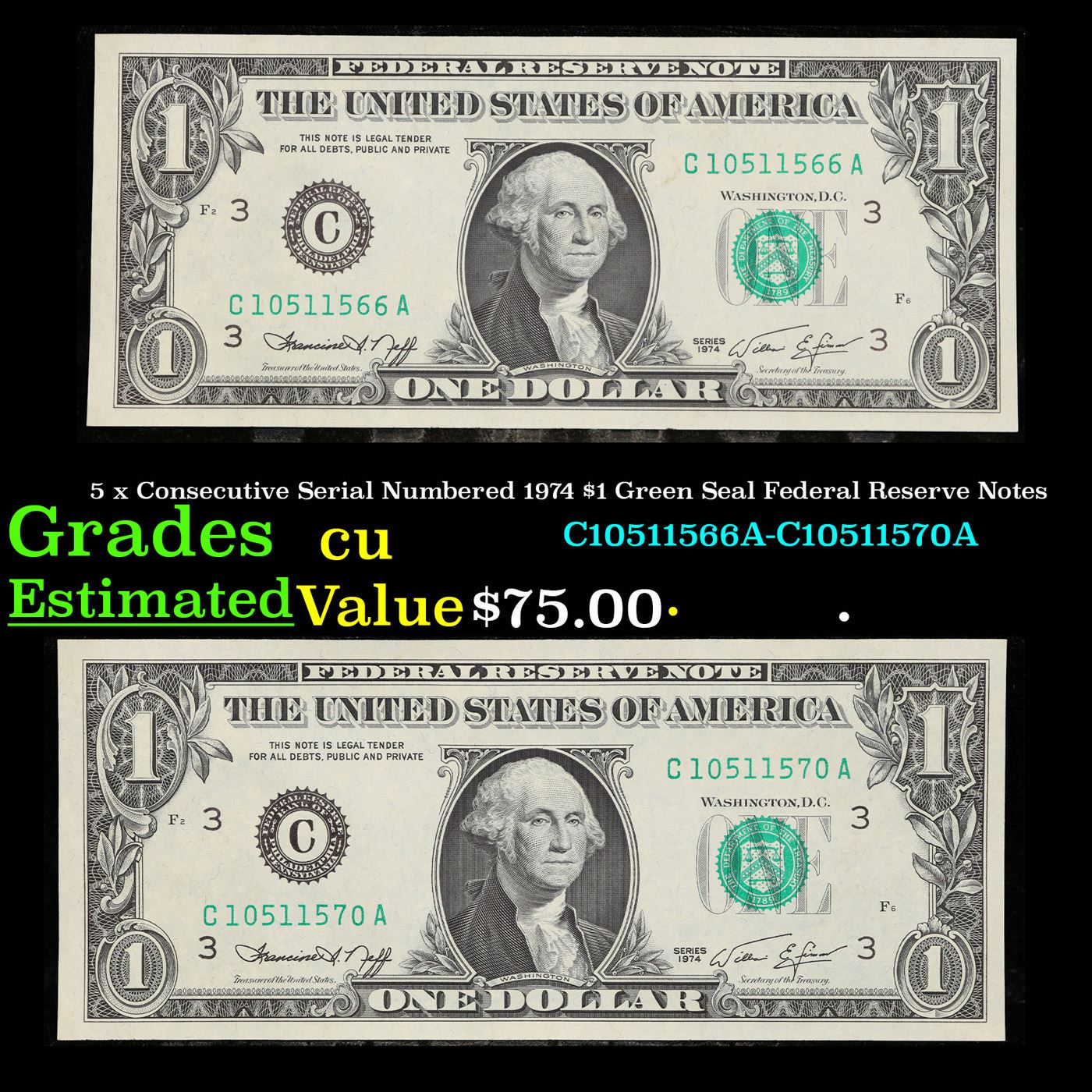 5 x Consecutive Serial Numbered 1974 $1 Green Seal Federal Reserve Notes Grades CU.