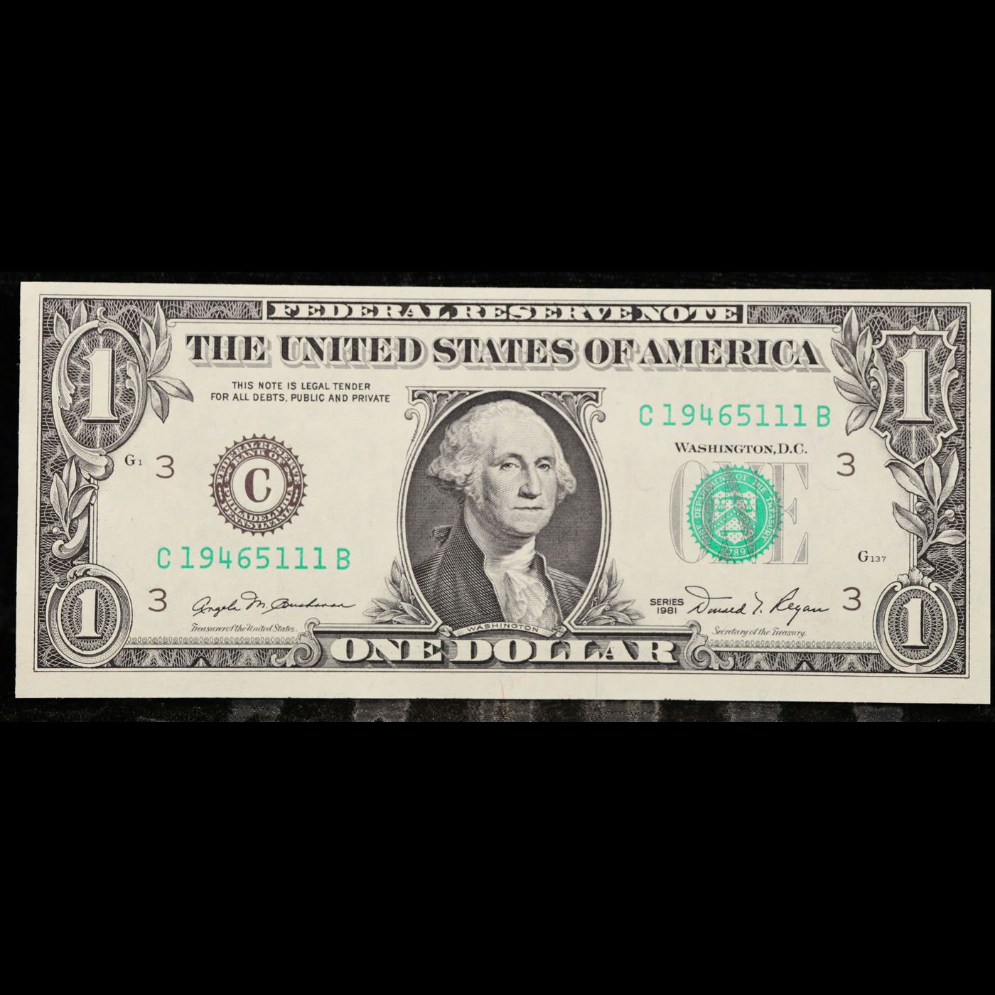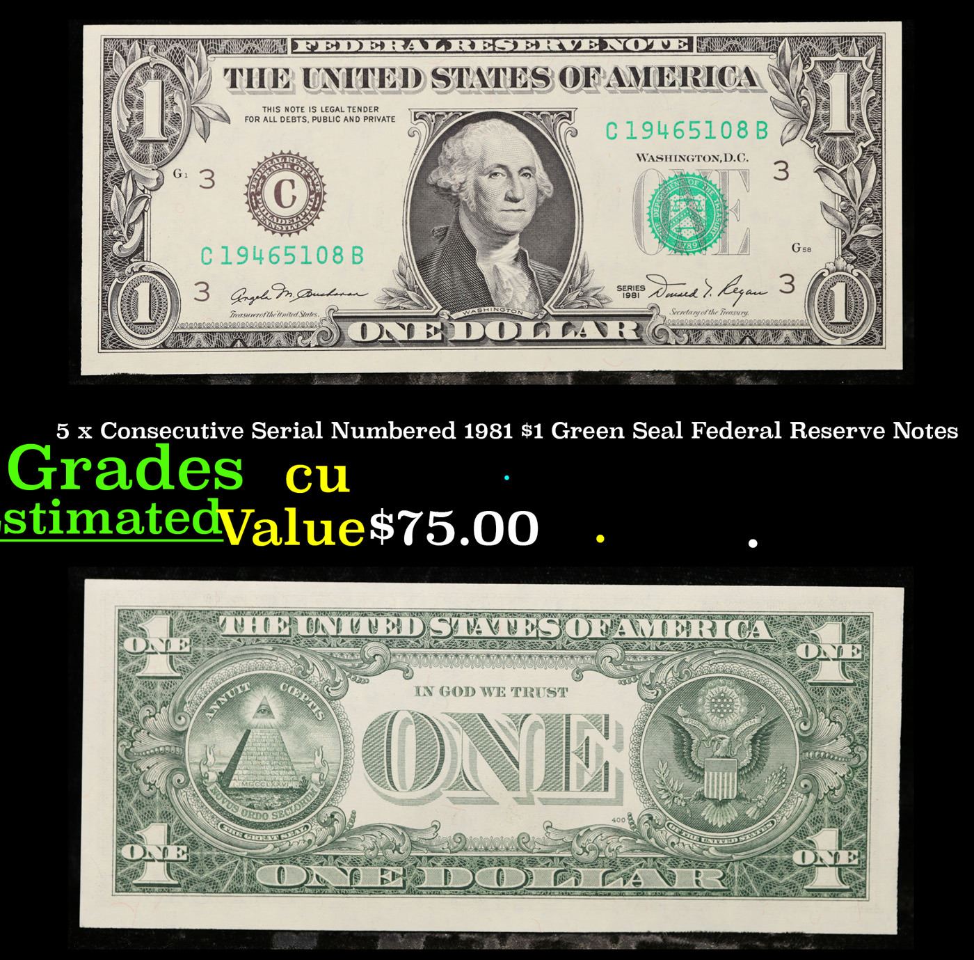 5 x Consecutive Serial Numbered 1981 $1 Green Seal Federal Reserve Notes Grades CU.