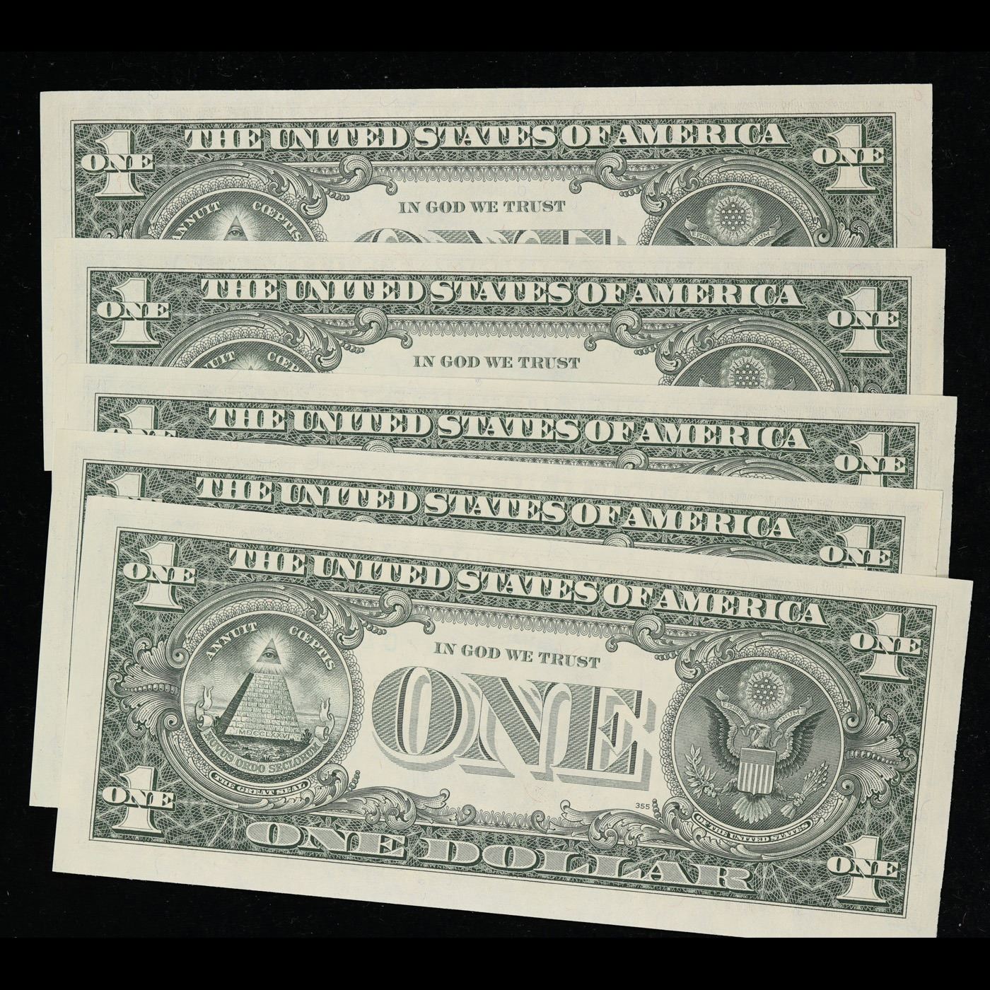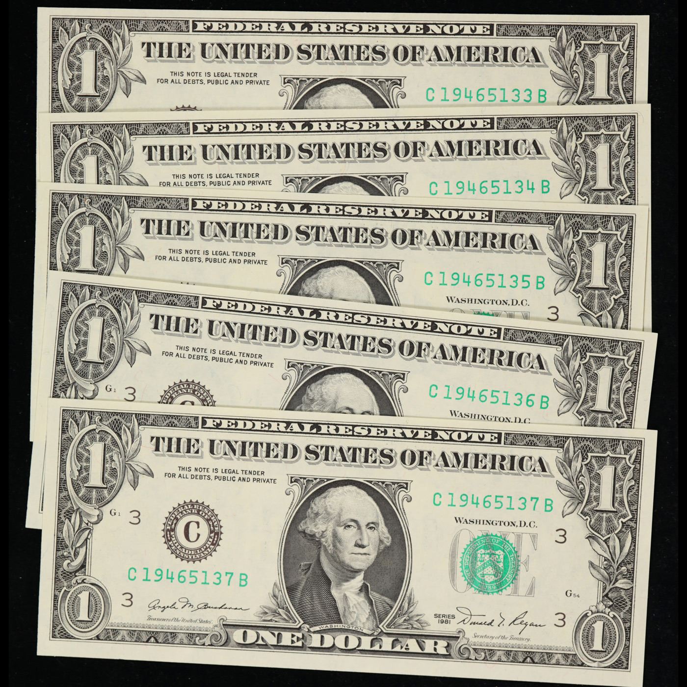 5 x Consecutive Serial Numbered 1981 $1 Green Seal Federal Reserve Notes Grades CU.