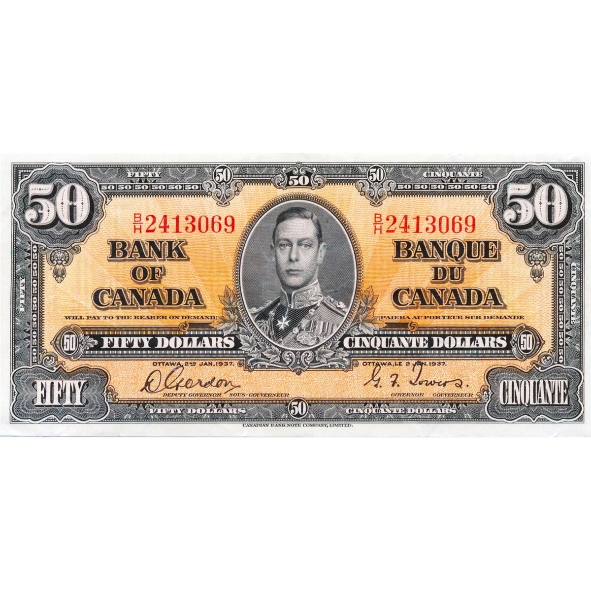 $50.00. 1937 Issue. BC-26b. No. B/H2413069. CCCS Extra Fine- 45.
