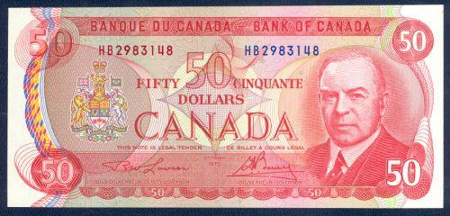 Bank of Canada; $50.00 1975, BC-51a, UNC, signature Lawson Bouey, serial # HB2983148. Very popular Musical Ride design.