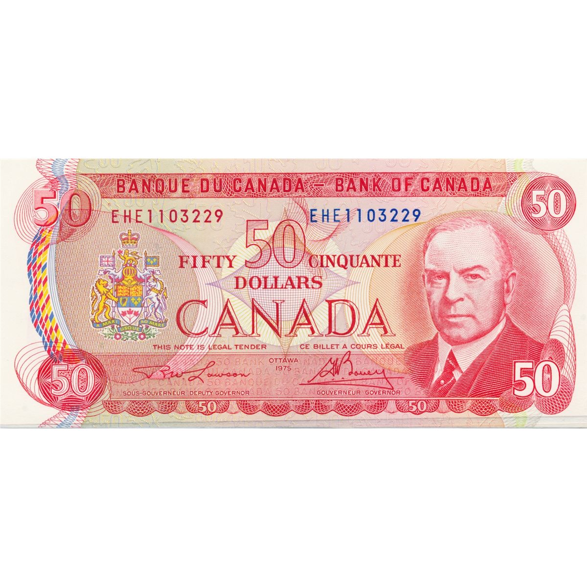$50.00. 1975 Issue. BC-51a-i. Lawson-Bouey. No. EHE1103229 & EHF0605711. Both CCCS graded Choice UNC-63. The second note is designated as a ‘Changeover’ note.