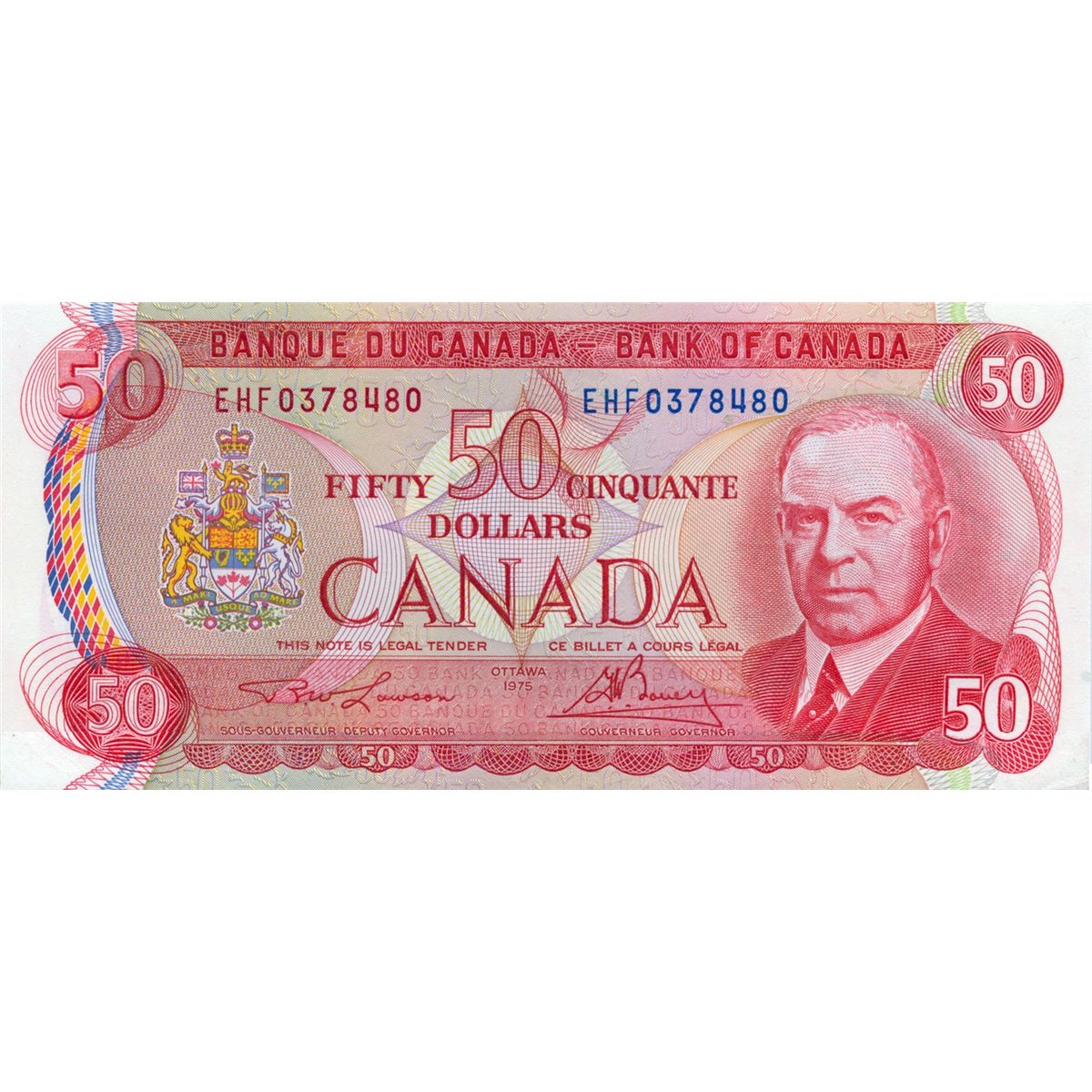 $50.00. 1975 Issue. BC-51a-i. Lawson-Bouey. No. EHF0378480 & EHF0378481. Both CCCS graded UNC-64. Both designated ‘Changeover’ notes.