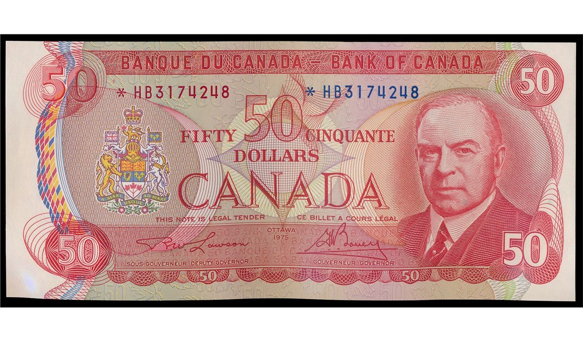 $50.00. 1975 Issue. BC-51aA. No. *HB3174248. Lawson-Bouey. Unc. A scarce replacement note.