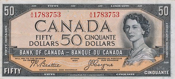 1954 Issue. BC-34b. Beattie-Coyne. ‘Devil’s Face’. No. A/H1783753. PMG graded AU-50.