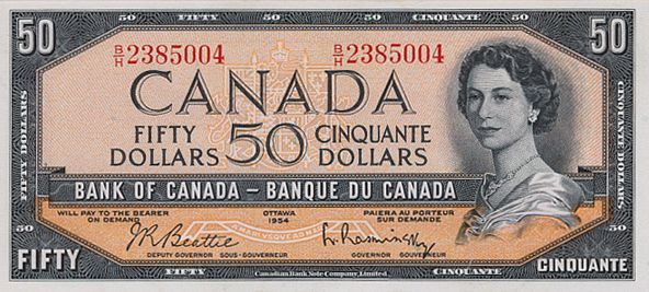 1954 Issue. BC-42b. Beattie-Rasminsky. No. B/H2385004. A ‘changeover’ note. BCS graded AI-50.