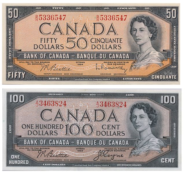 1954 Issue. BC-42b. Beattie-Rasminsky. Modified. No. B/H5336547. CCCS graded UNC-60; $100.00. 1954 Issue. BC-43a. Beattie-Coyne. Modified. No. A/J3463824. CCCS graded AU-50. (changeover). Lot of two (2) notes.