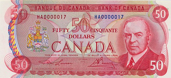 1975 Issue. BC-51a. No HA0000017. Lawson-Bouey. A low serial no. note. CH. UNC.