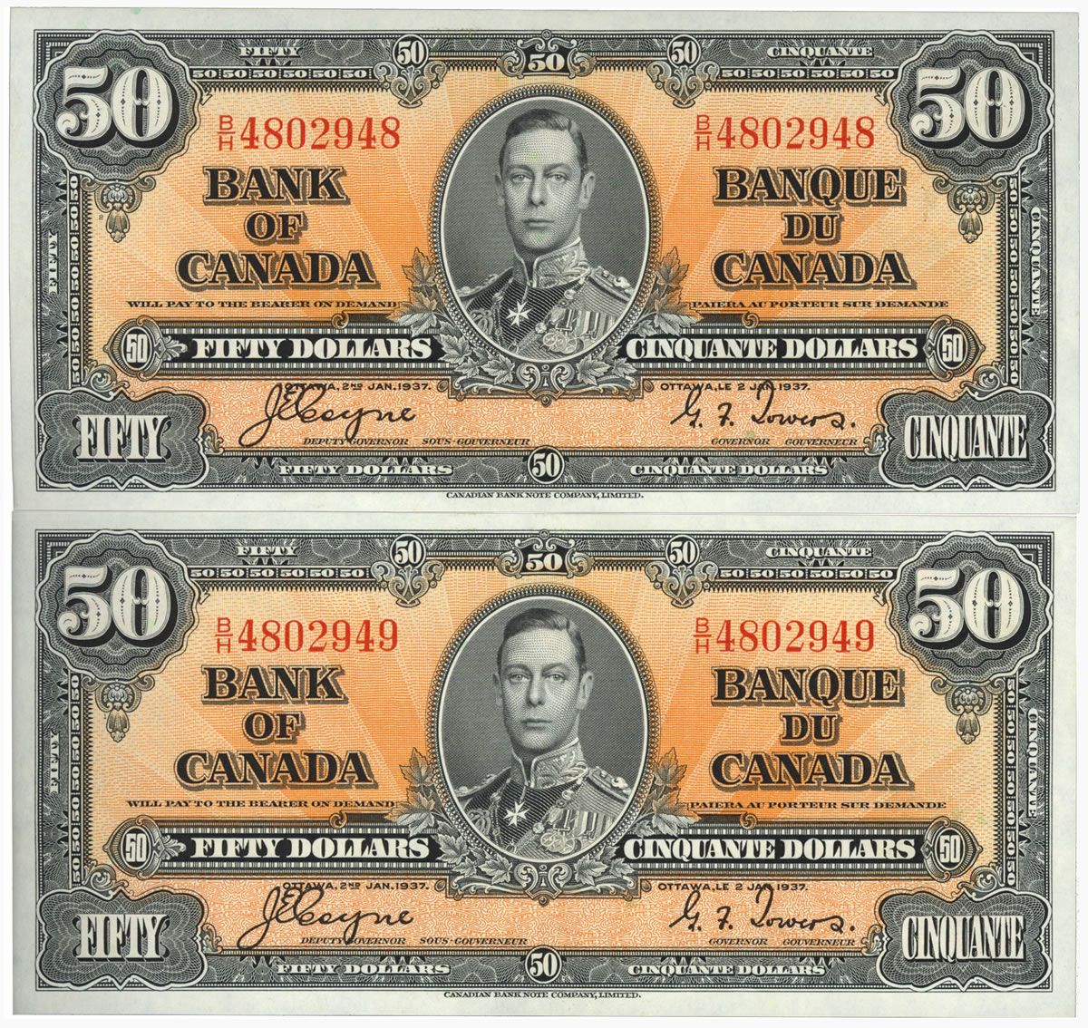 BC-26c. Coyne-Towers. Set of two (2) consecutive numbered notes. No. B/H4802948-9. Both graded Uncirculated. Lot of two (2) notes.
