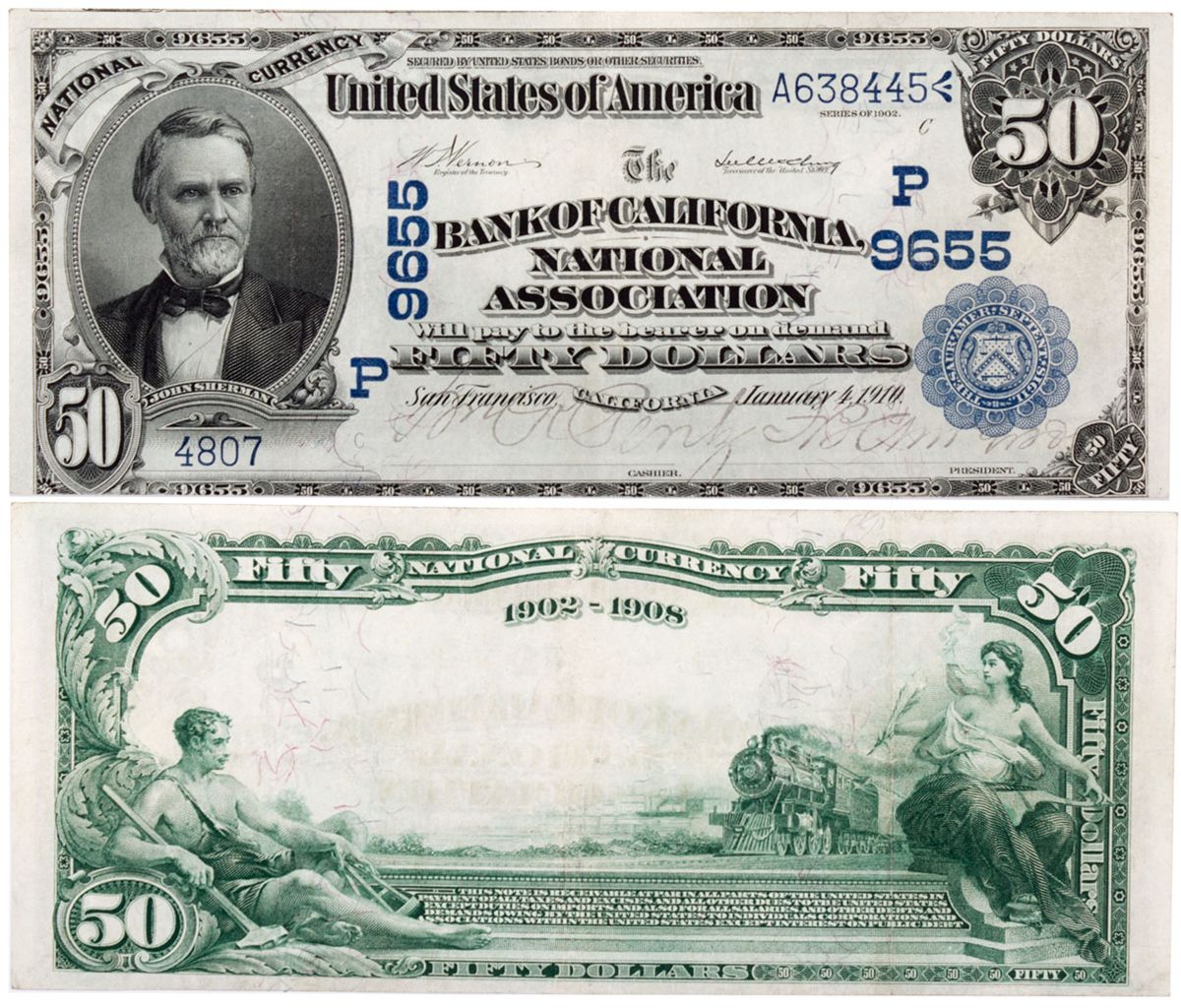 F670. 20 known in this denomination. This note is possibly tied for the finest known, and is certainly among the top 4 in condition. The Bank of California made its fortune on the mines of the Comstock. -61824