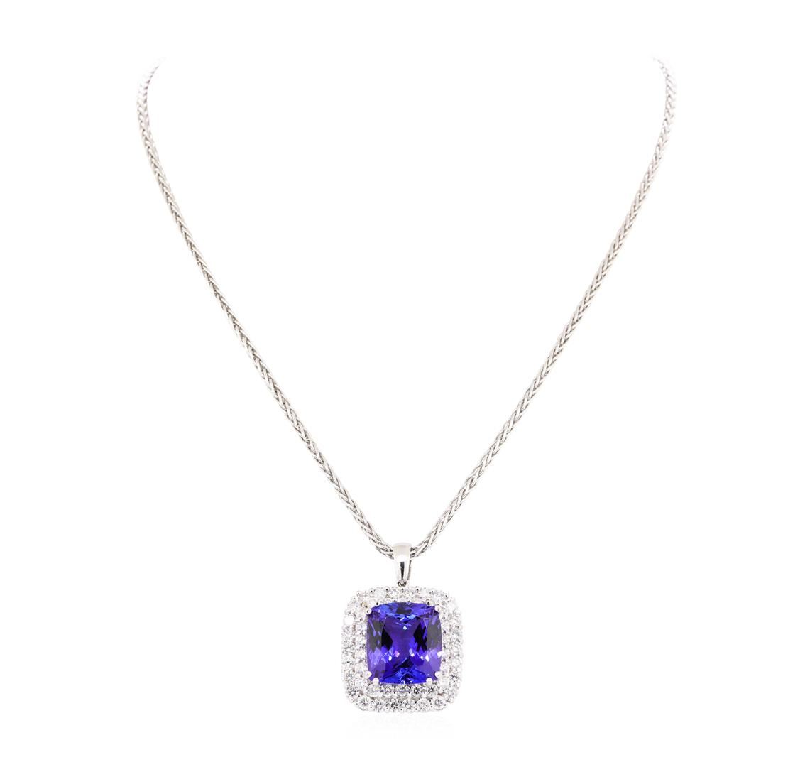 One electronically tested 14KT white gold lady's combination cast & assembled fashion pendant & chain 18.0' long, 2.3 mm square wheat link with a lobster claw clasp with a double cushion halo with a bright polish finish. The featured lady's necklace has a drop of 37 millimeters in length. Identified with markings of '14K'. Condition is new, good workmanship. Containing: One prong set square cushion modified brilliant cut natural tanzanite, measuring 17.20 x 15.55 x 22.65mm, (depth est.) 5%. bulge factor, approximate weight of 50.20ct., clarity is eye clean, medium dark, strong, violetish blue color, (GIA vB 6/5), cut is very good. Colored gemstones are presumed to have been subjected to commonly used enhancement processes. Transmitting light with no distortion, transparent. Graded in the setting. Twenty-Two prong set round brilliant cut diamonds, measuring 2.80 - 2.75 x 1.70mm (depth est.) approximate total weight of 22 Stones = 1.80ct. Graded in the setting. Color G - H Clarity VS-2 to SI-2 Cut Very Good Twenty-Six prong set round brilliant cut diamonds, measuring 3.00 - 2.90 x 1.80mm (depth est.) approximate total weight of 26 Stones = 2.50ct. Graded in the setting. Color H - I Clarity SI-1 to SI-2 Cut Very Good. Total Weight of Colored Stones 50.20ct.. Total Weight of Diamonds 4.30ct.. Total Weight of Pendant & Chain 30.00gm GAS Appraised at $59795.00. GAS Appraised.