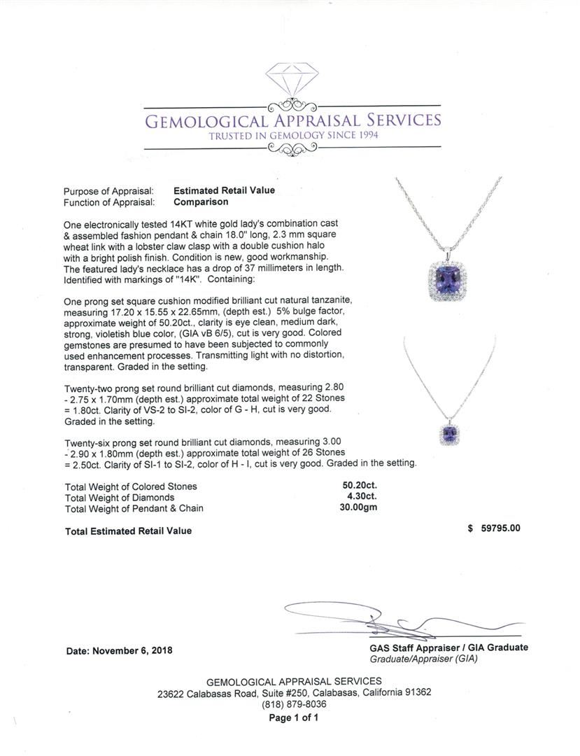 One electronically tested 14KT white gold lady's combination cast & assembled fashion pendant & chain 18.0' long, 2.3 mm square wheat link with a lobster claw clasp with a double cushion halo with a bright polish finish. The featured lady's necklace has a drop of 37 millimeters in length. Identified with markings of '14K'. Condition is new, good workmanship. Containing: One prong set square cushion modified brilliant cut natural tanzanite, measuring 17.20 x 15.55 x 22.65mm, (depth est.) 5%. bulge factor, approximate weight of 50.20ct., clarity is eye clean, medium dark, strong, violetish blue color, (GIA vB 6/5), cut is very good. Colored gemstones are presumed to have been subjected to commonly used enhancement processes. Transmitting light with no distortion, transparent. Graded in the setting. Twenty-Two prong set round brilliant cut diamonds, measuring 2.80 - 2.75 x 1.70mm (depth est.) approximate total weight of 22 Stones = 1.80ct. Graded in the setting. Color G - H Clarity VS-2 to SI-2 Cut Very Good Twenty-Six prong set round brilliant cut diamonds, measuring 3.00 - 2.90 x 1.80mm (depth est.) approximate total weight of 26 Stones = 2.50ct. Graded in the setting. Color H - I Clarity SI-1 to SI-2 Cut Very Good. Total Weight of Colored Stones 50.20ct.. Total Weight of Diamonds 4.30ct.. Total Weight of Pendant & Chain 30.00gm GAS Appraised at $59795.00. GAS Appraised.