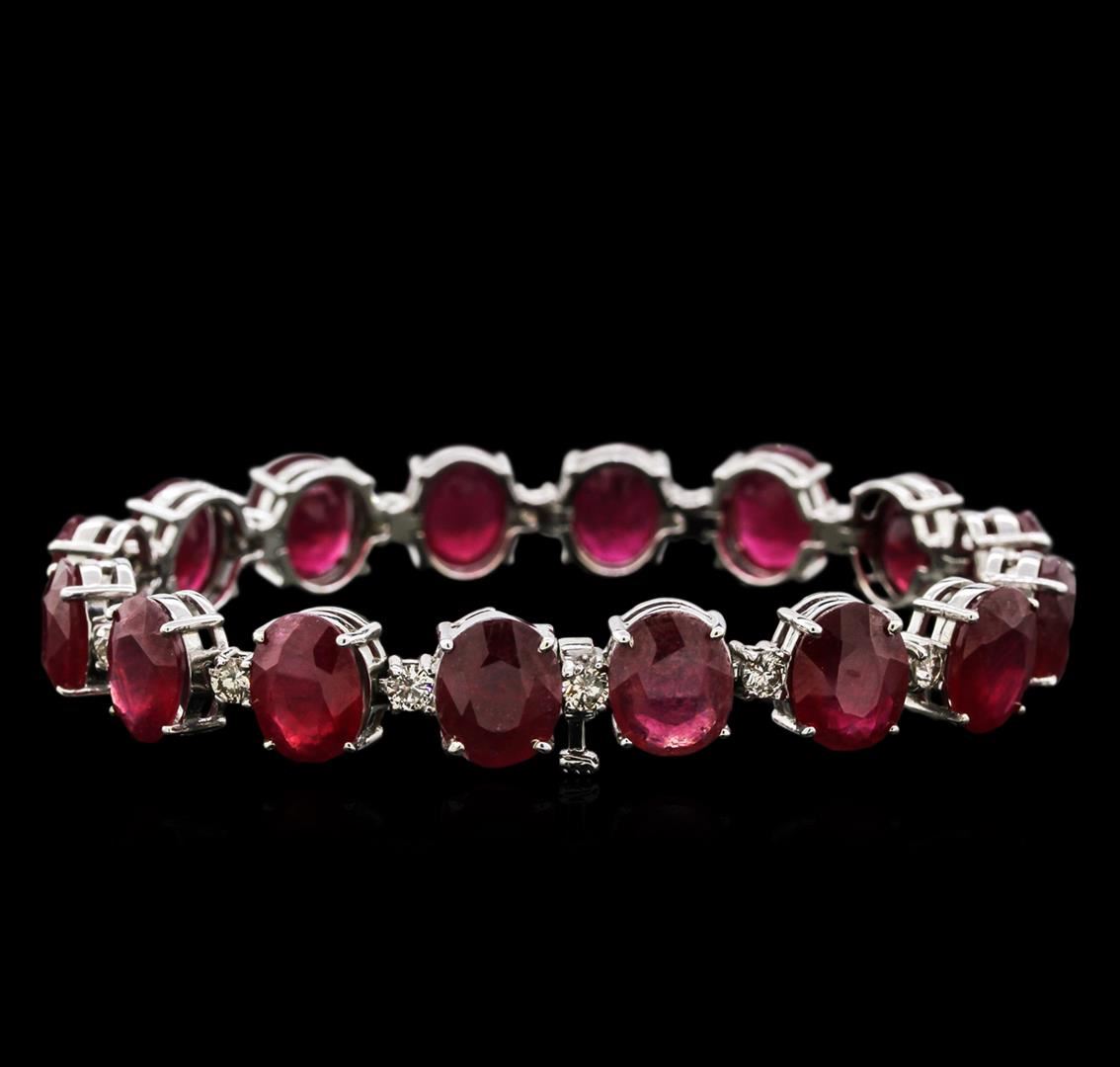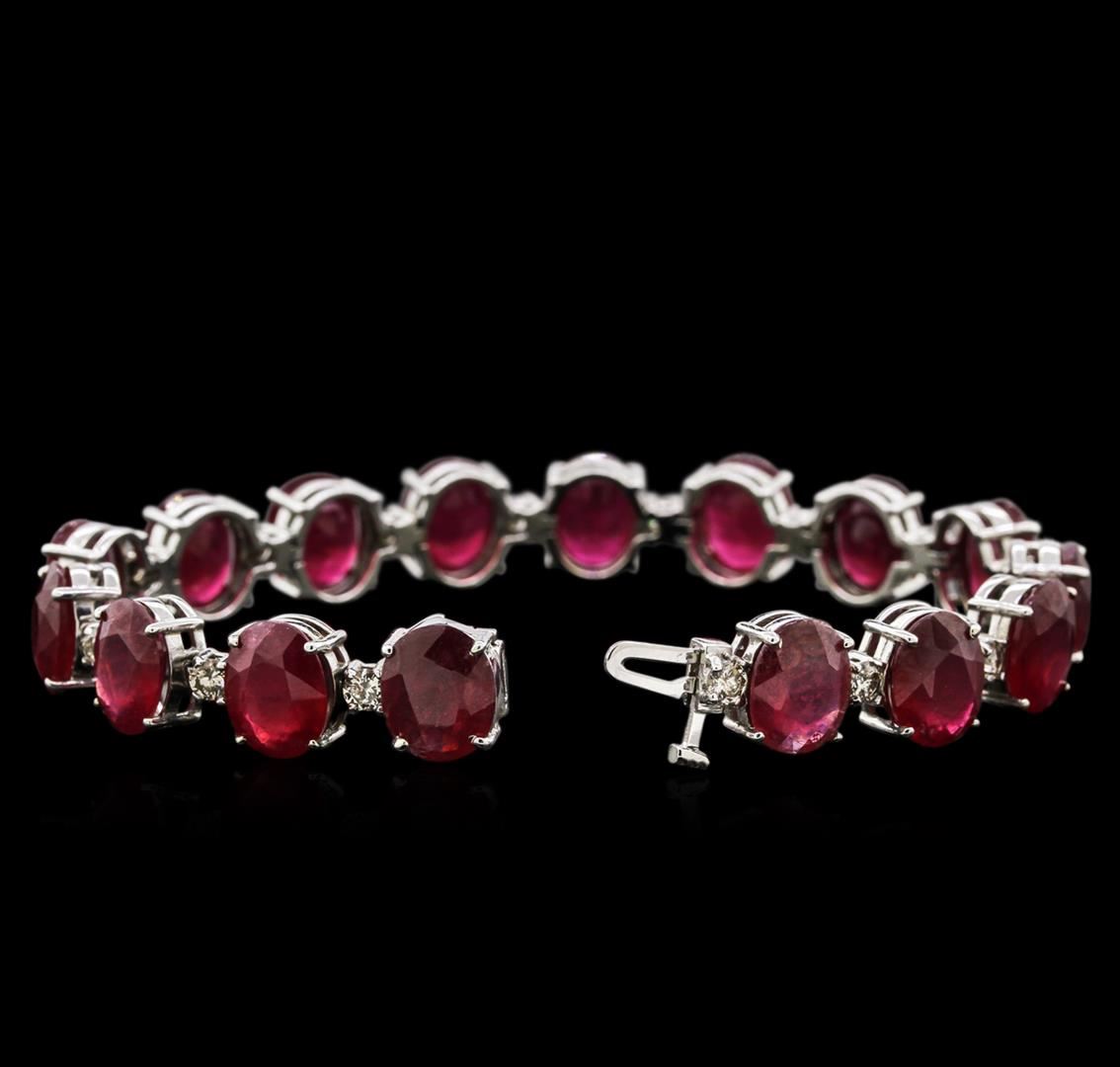 One 14K White Gold Lady's Bracelet. 26.60 GR. 7 Inches. Containing: Main Gemstones: Identity: Natural Corundum, Ruby. Carat Weight 50.30 CTS 16PCS. Shape & Measurement: Oval Shape. Approx: 10.00 X 8.00 MM. Quality: Enhanced Quality. Fine Medium Color. Adjacent Gemstones: Identity: Natural Diamond. Shape: Round Cut. 16 PCS. Carat Weight: 1.63 CTS TW. Quality: SI Clarity, H-I Color. All Fine Cutting And Proportions. Total Gemstones Weight: 51.93 CTW TW. RBGS Appraised.