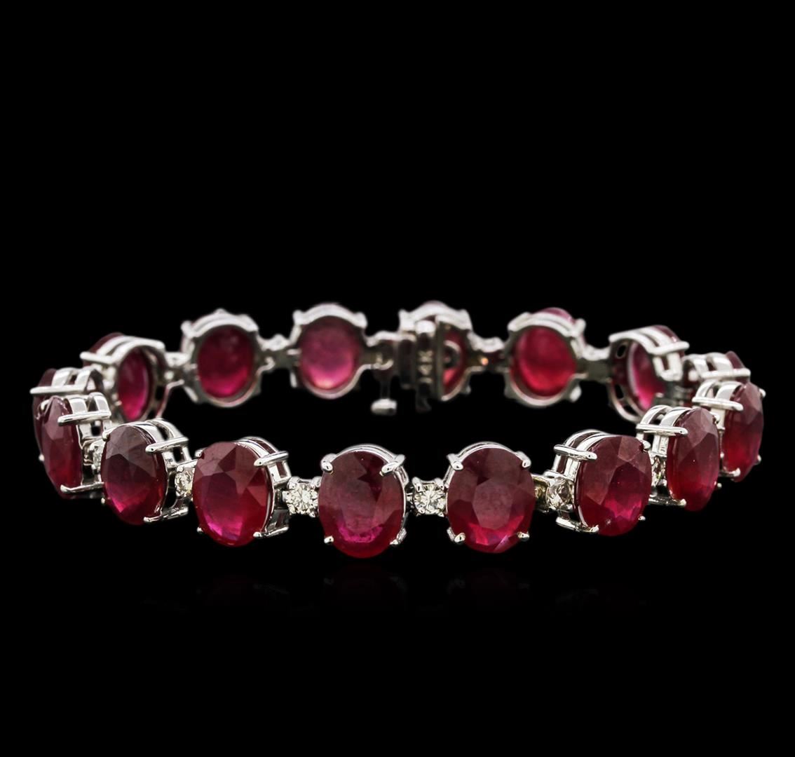 One 14K White Gold Lady's Bracelet. 26.60 GR. 7 Inches. Containing: Main Gemstones: Identity: Natural Corundum, Ruby. Carat Weight 50.30 CTS 16PCS. Shape & Measurement: Oval Shape. Approx: 10.00 X 8.00 MM. Quality: Enhanced Quality. Fine Medium Color. Adjacent Gemstones: Identity: Natural Diamond. Shape: Round Cut. 16 PCS. Carat Weight: 1.63 CTS TW. Quality: SI Clarity, H-I Color. All Fine Cutting And Proportions. Total Gemstones Weight: 51.93 CTW TW. RBGS Appraised.
