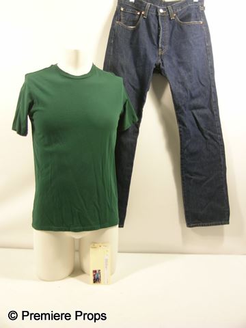 Adam (Joseph Gordon-Levitt) screen worn, green short sleeve crew neck 'Gap' t-shirt, (size S) and dark blue denim 'Levis' jeans. Includes wardrobe tag! This is the key costume that he wears when Kyle and him shave his head.