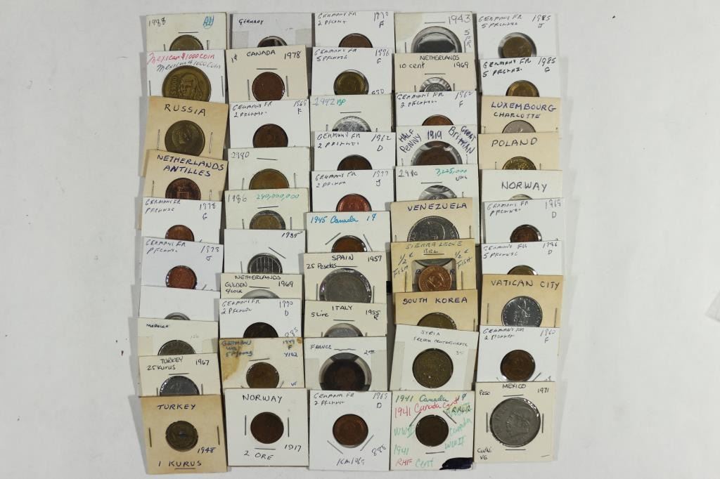 50 ASSORTED FOREIGN COINS ALL FLIPPED AND MARKED