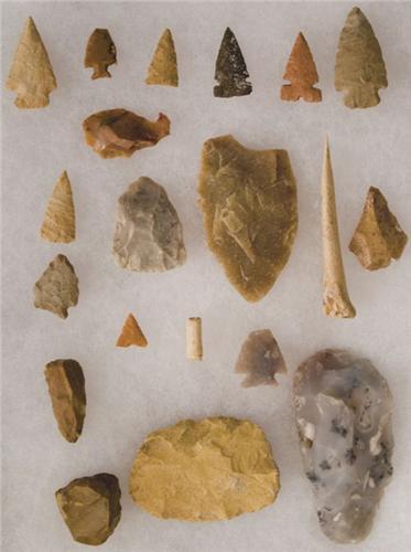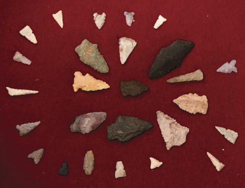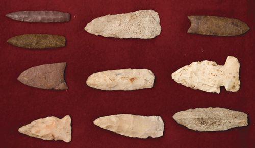 Three frames of app. 50 Arrowheads, Awls, Knives, and Scrapers. Some points broken. est $200-300)