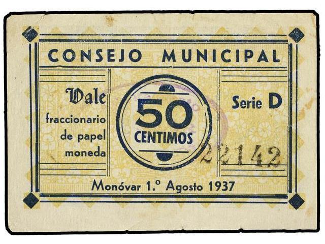 50 Céntimos. 1 Agosto 1937. C.M. MONOVAR (ALICANTE). ESCASO. M-939B. MBC.