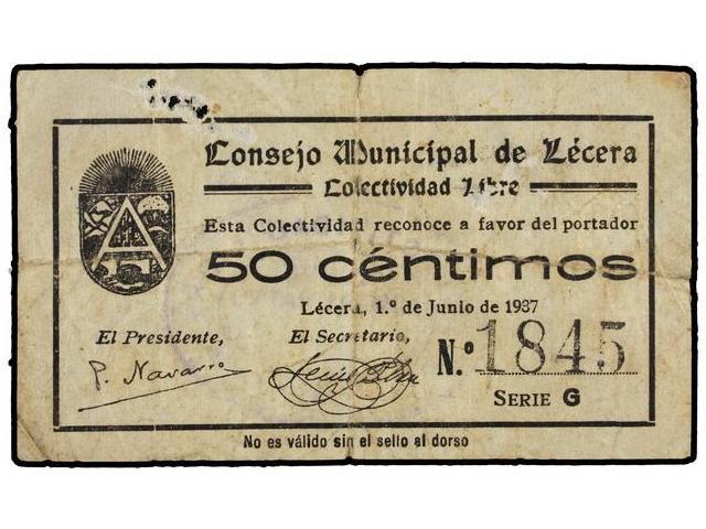 50 Céntimos. 1 Junio 1937. C.M. de LÉCERA (Zaragoza). (Roturas). Mont-815e. MBC-.
