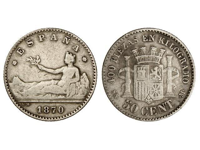 50 Céntimos. 1870 (*7-0). SN-M. Cifra de la primera estrella visible, pero algo floja. MBC-.