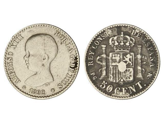 50 Céntimos. 1892 (*2-2). P.G.-M. Pátina en reverso. (Rayitas en anverso). MBC-.