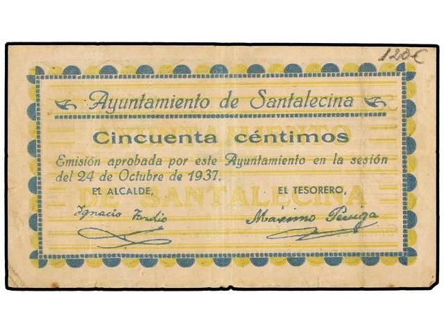 50 Céntimos. 24 Octubre 1937. Ay. de SANTALECINA (Huesca). Mont-1324A. MBC+.