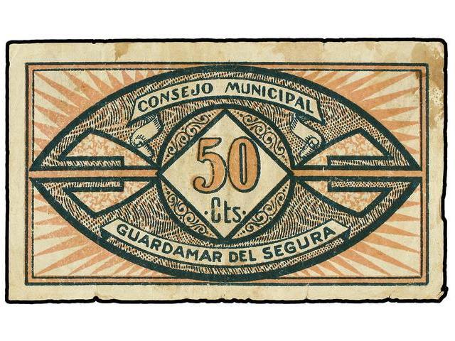 50 Céntimos. 5 Junio 1937. C.M. de GUARDAMAR DEL SEGURA (Alicante). (Manchitas. Pequeñas roturas). ESCASO. Mont-744B; TV-826. (MBC).