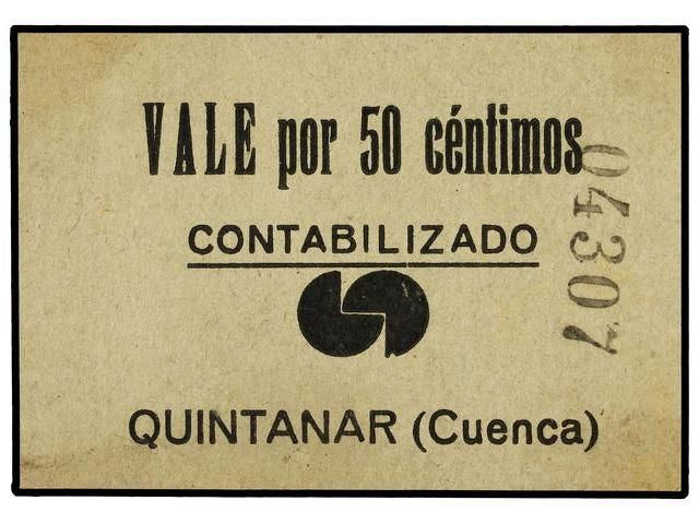 50 Céntimos. ALCALDÍA de QUINTANAR DEL REY (Cuenca). Cartón. (Algo sucio). MUY ESCASO. KG-626a. SC.