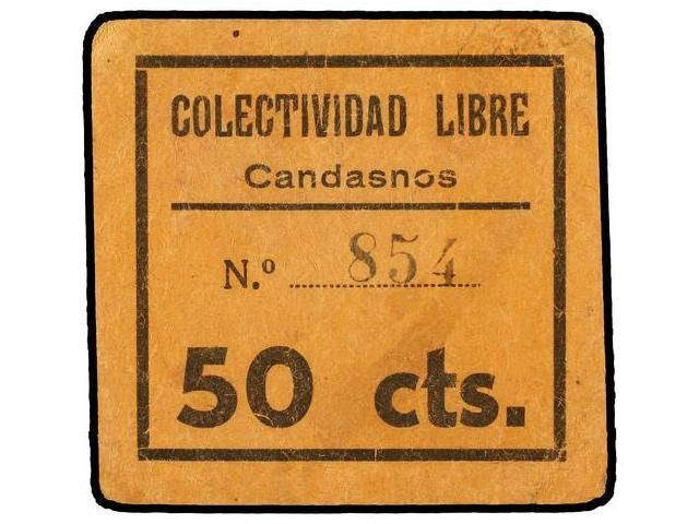 50 Céntimos. COLECTIVIDAD LIBRE de CANDASNOS (Huesca). Cartón. MUY RARO. KG-230b. MBC+.