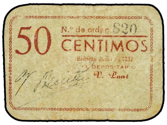 50 Céntimos. Junio 1937. C.M. de BAÑERES (Alicante). Cartulina. Mont-228B; TV-246b. MBC-.
