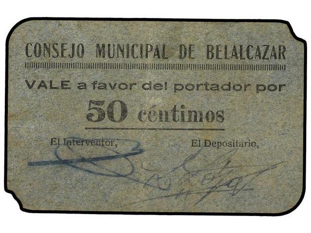 50 Céntimos. S/F. C.M. de BELALCAZAR (Córdoba). Cartoncillo. Los cuatro billetes de la localidad mismo tamaño, recortado para identificación de las personas ciegas.