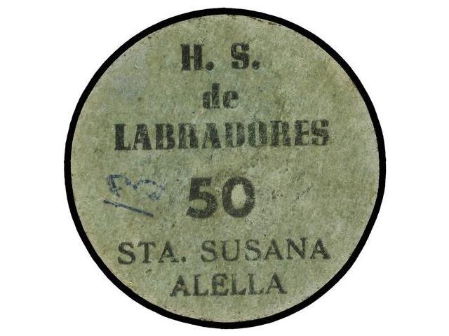 50 Céntimos?. S/F. HDAD.SIND. LABRADORES SANTA SUSANA ALELLA. Cartón redondo. ESCASO. L-No cat. MBC+.