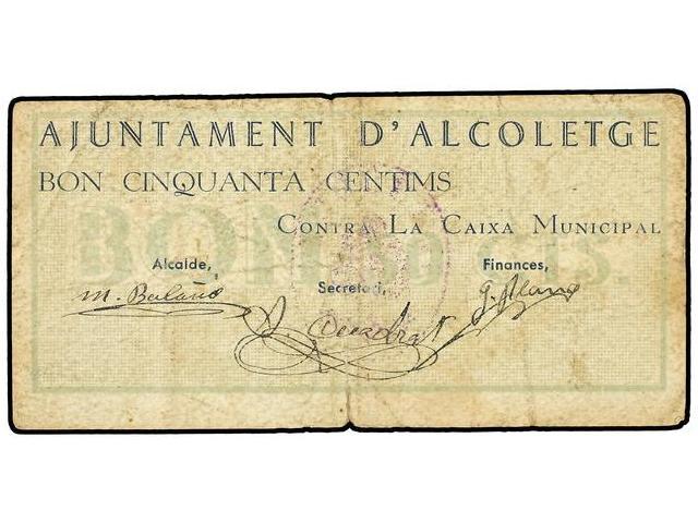 50 Cèntims. 1 Juliol 1937. Aj. d´ALCOLETGE. (Sucio). AT-81; T-104. MBC-.