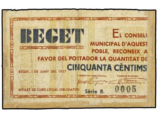 50 Cèntims. - 1 Juny 1937. - C.M. de BEGET. - Nº 5. (Pequeñas roturas. Márgenes reparados). MUY ESCASO. AT-333a; T-398a. BC. - -
