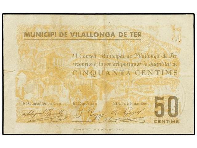 50 Cèntims. 1 Juny 1937. C.M. de VILALLONGA DE TER. (Pequeña rotira en margen derecho). MUY ESCASO. AT-2810; T-3251. MBC-.