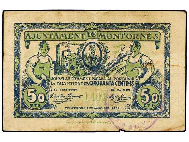 50 Cèntims. 1 Maig 1937. Aj. de MONTORNÈS. (Pequeñas roturas en margen inferior. Sucio). AT-1592; T-1828. MBC+.