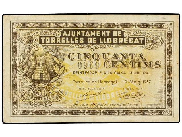 50 Cèntims. 10 Maig 1937. Aj. de TORRELLES DE LLOBREGAT. ESCASO. AT-2556b; T-2973b. MBC+.